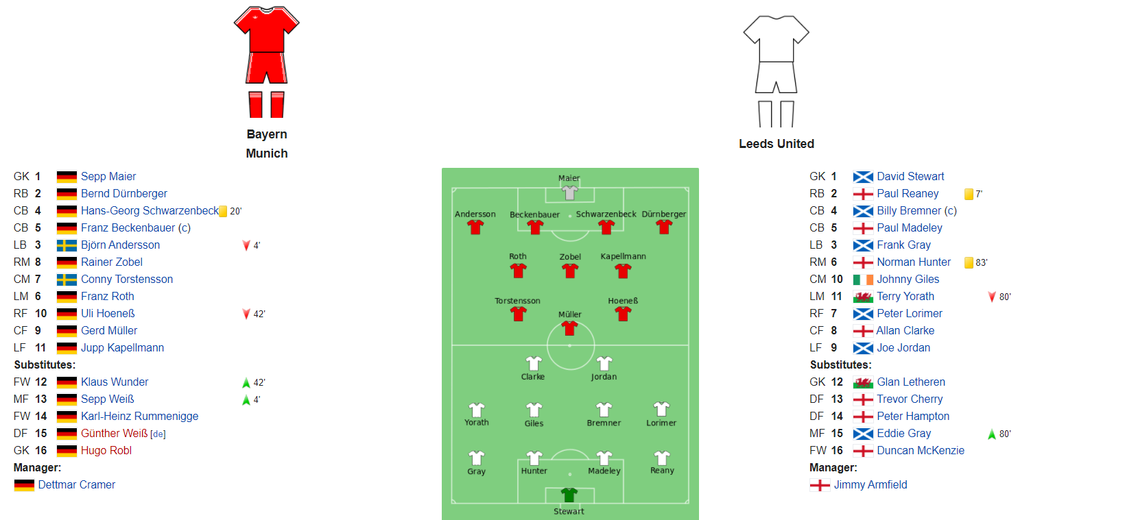 Leeds dominated the first half and Bayern, captained by another legend, Franz Beckenbauer and full of household names like Gerd Muller were on the back foot. Two substitutions due to injury to Uli Hoeneß and Björn Andersson (who later went on to form the pop group Abbam Ok, he didn't but I was checking you are still awake!), added to the Bavarians anguish but at half time, it was still 0-0 due to two mysterious penalty decisions that went against Leeds, both fouls that came about through desperate Bayern defending.