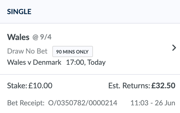 I'll be having a few bets on the knockout stages starting with a £200 bank. I'll begin with a tenner on Wales to win in 90 minutes on the draw no bet market. I got 9/4 with Coral.