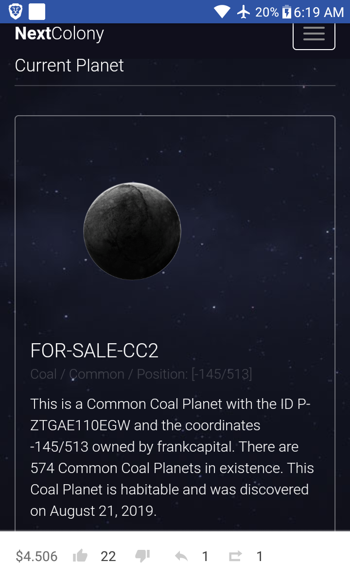 Ok PM2 is ready now. All ships on PM2 has been evacuated. Now this is a RARE @nextcolony PLANET which goes for MUCH HIGHER in price. It even looks REALLY COOL. Here is a post a few weeks ago. https://partiko.app/frankcapital/for-sale-new-found-nextcolony-rare-coal-planet-with-the-id-pzbc774cbnsw-and-the-coordinates-368546-for-sale-jevxqddh?