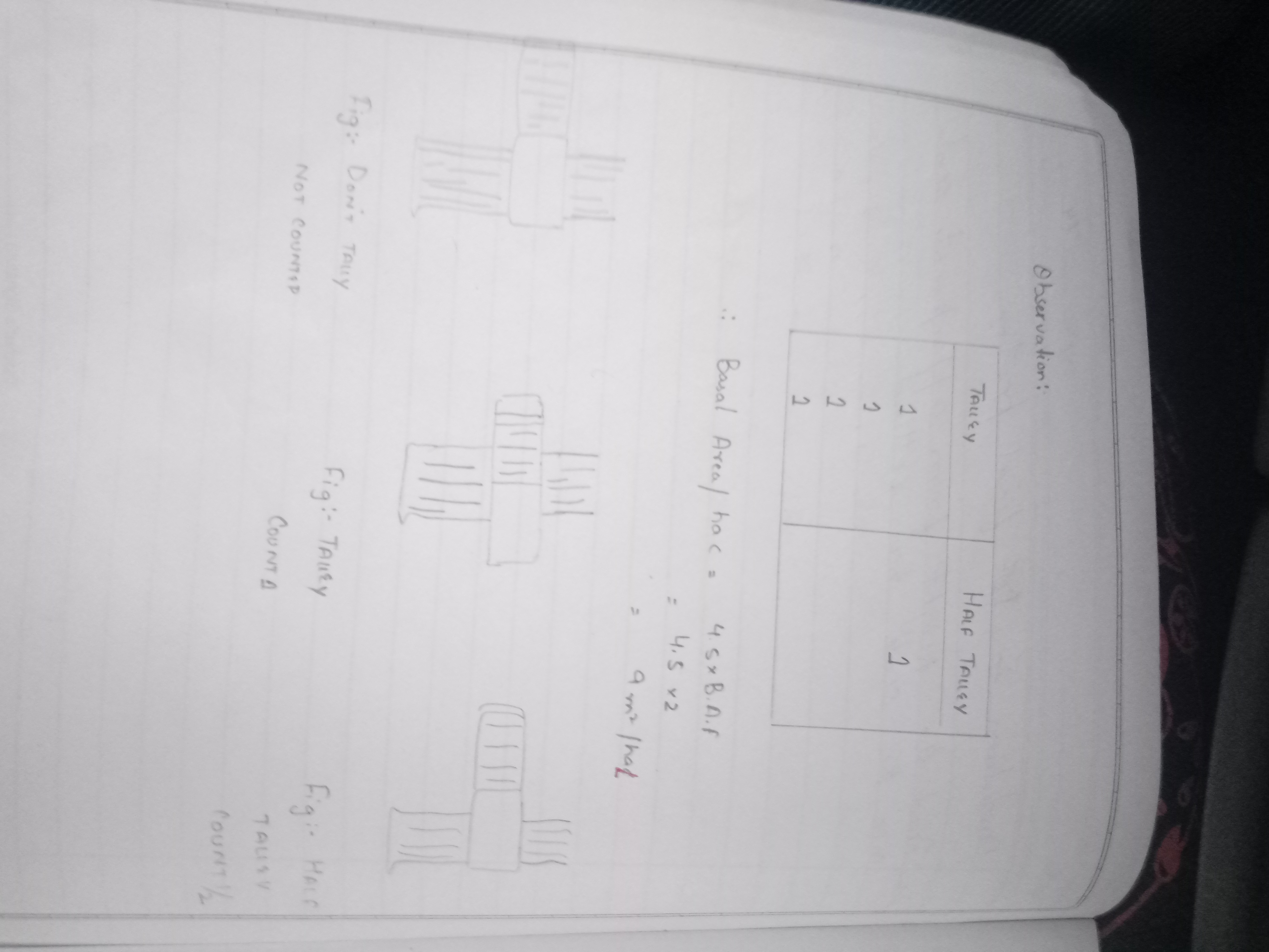 3.Multiply the counted trees with respective basal area factor of the prism to get basal area in m²/hac.