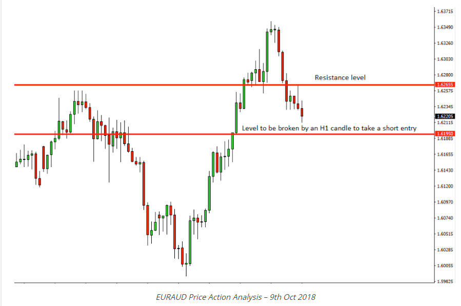As the chart shows that the price has been heading down after making that Bearish Engulfing candle at a very important level of Resistance. The level of 1.62655 is the level of intraday Resistance. The price had a strong rejection from this level earlier today. Now the level of 1.61950 is the level of Support here, which has to be broken by an H4 candle and to produce an H1 Bearish candle later to offer us the short entry. Let us have a look at the summary of the trade…
