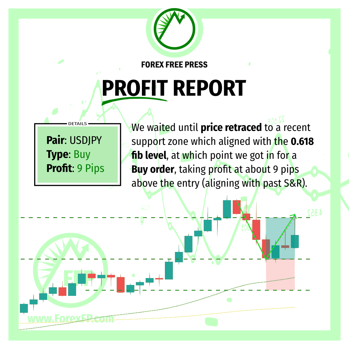 We waited until price retraced to a recent support zone which aligned with the 0.618 fib level, at which point we got in for a Buy order, taking profit at about 9 pips above the entry (aligning with past S&R).