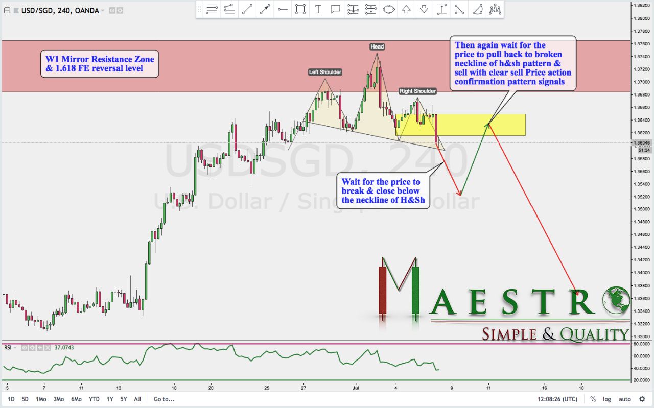 On H4 chart we may notice that beautiful bearish H&Sh pattern is about to form. Once this reversal pattern form we will wait for the price to pullback to broken zone between neckline and right shoulder. And in this kill zone if we spot any bearish pattern confirmation signals we will short this pair next week