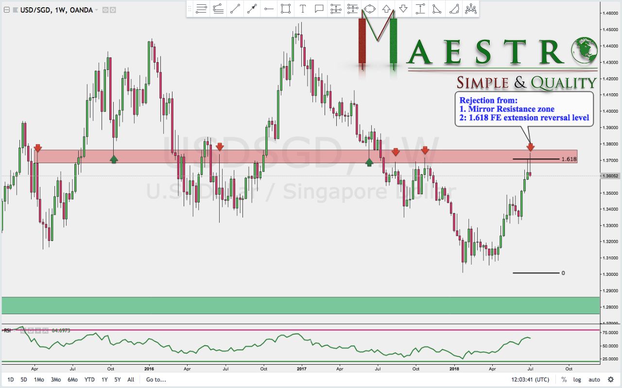 On W1 chart we may notice that USDSGD is about to get rejected from Weekly Mirror Resistance zone, confluencing with 1.618 Fibonacci Extension reversal level. If crazy news or banks wont push the Dollar strength USDSGD on W1 chart candlestick which closes today will get rejected from this major resist