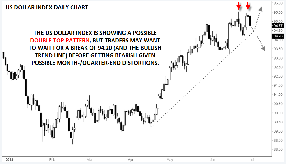 While we recognize this may eventually end up being a two times top routine, bulls may choose to avoid flipping their prospect on the world's reserve money just yet. For just one, the pattern will not be established until and unless rates break below the "neckline" (or the trough between to both highs) at 94.20; until that point, traders may favor to place more excess weight on the dollar's proven bullish trend.