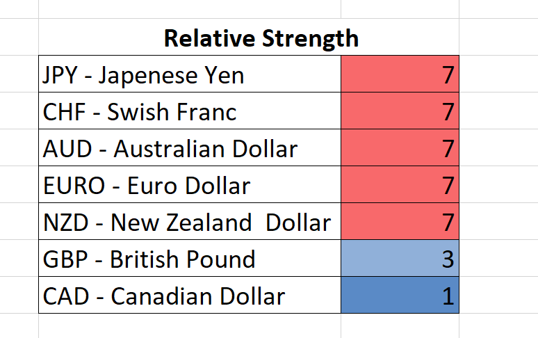 the currency relative strength relative to the US dollar is the following: