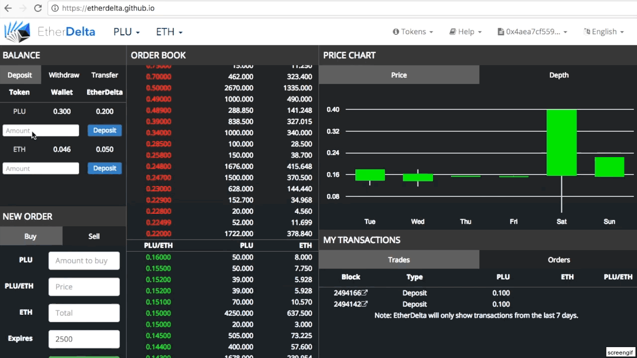 After you’ve selected an account, depositing funds is easy! In the Deposit/Withdraw/Transfer window in the top left, select Deposit, then select the amount of either Ethereum or tokens you would like to deposit. You will then be asked to sign or accept the transaction. Once the transaction has been sent, your funds are deposited securely into the smart contract on the Ethereum network. Then, you’ll be able to trade on ForkDelta with those funds! For an example using MetaMask, watch the gif below.