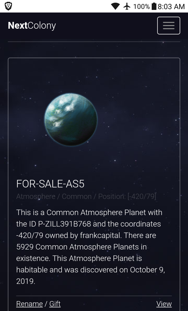 [FOR SALE] New Found @nextcolony Common Atmosphere Planet with the ID P-ZILL391B768 and the coordinates -420/79 [FOR SALE]