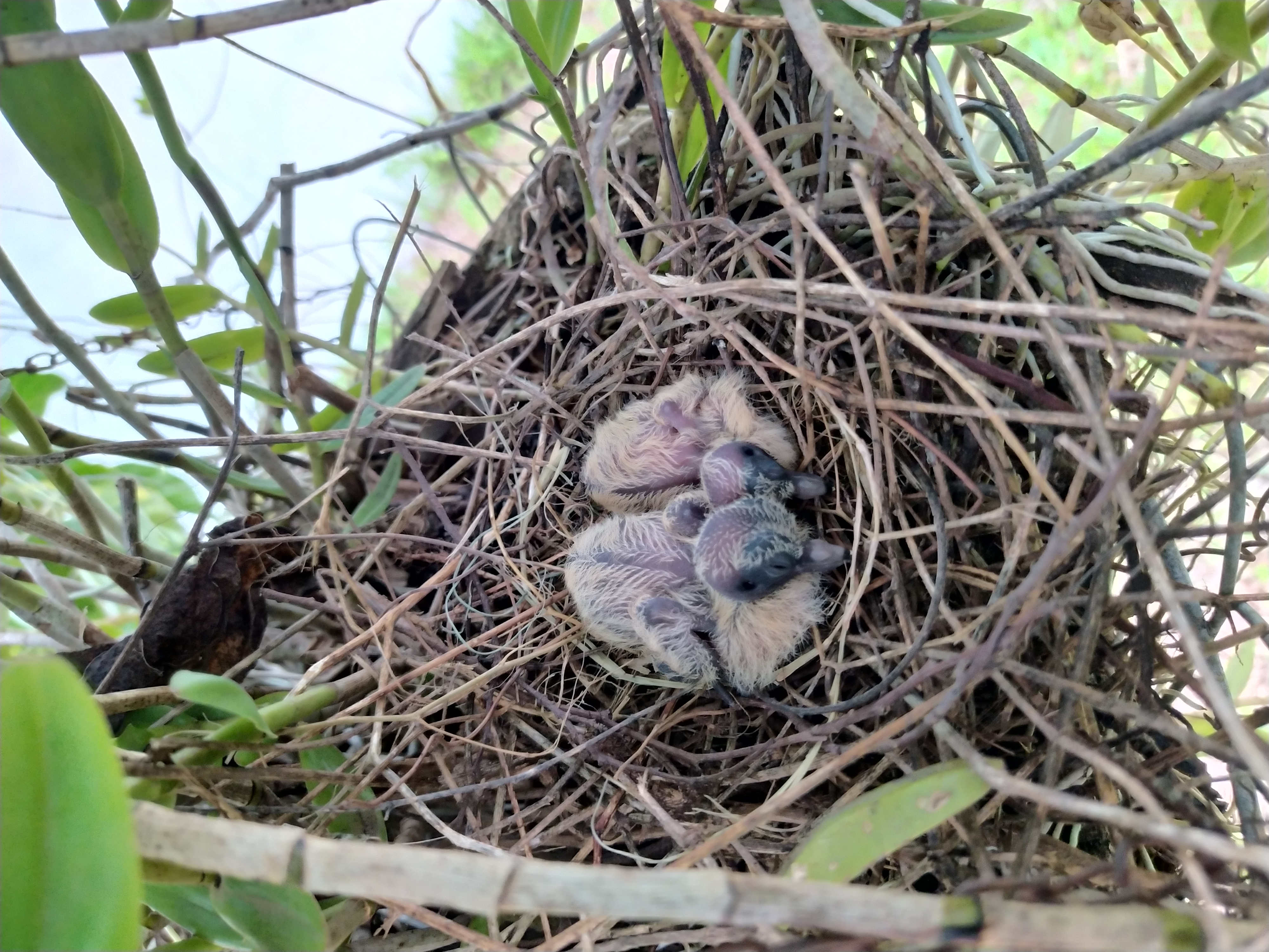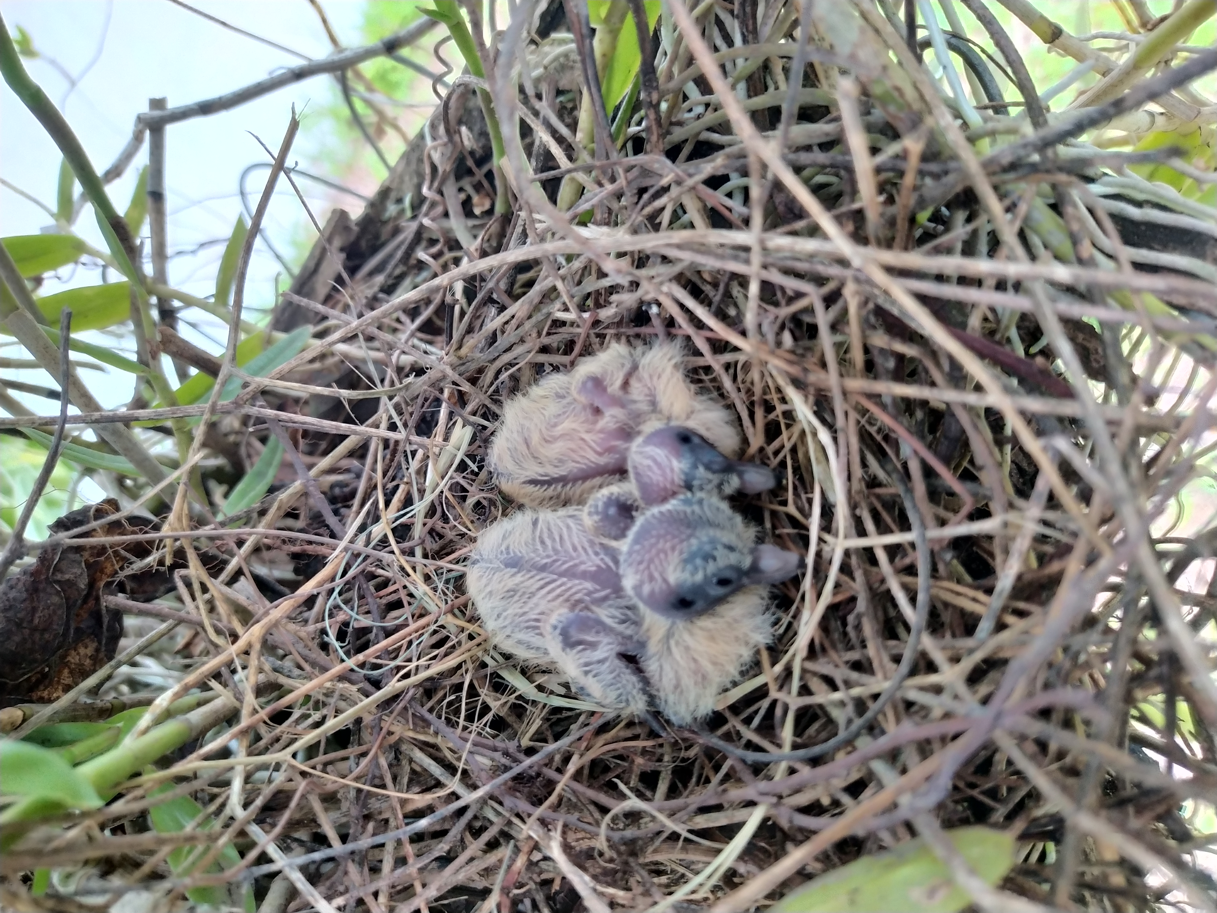Un par de pajaritos con pocos días de nacidos, frágiles indefensos,solos por ahora, dado que su madre ha salido a buscar el alimento necesario, para ayudarlos a crecer y a emplumar.