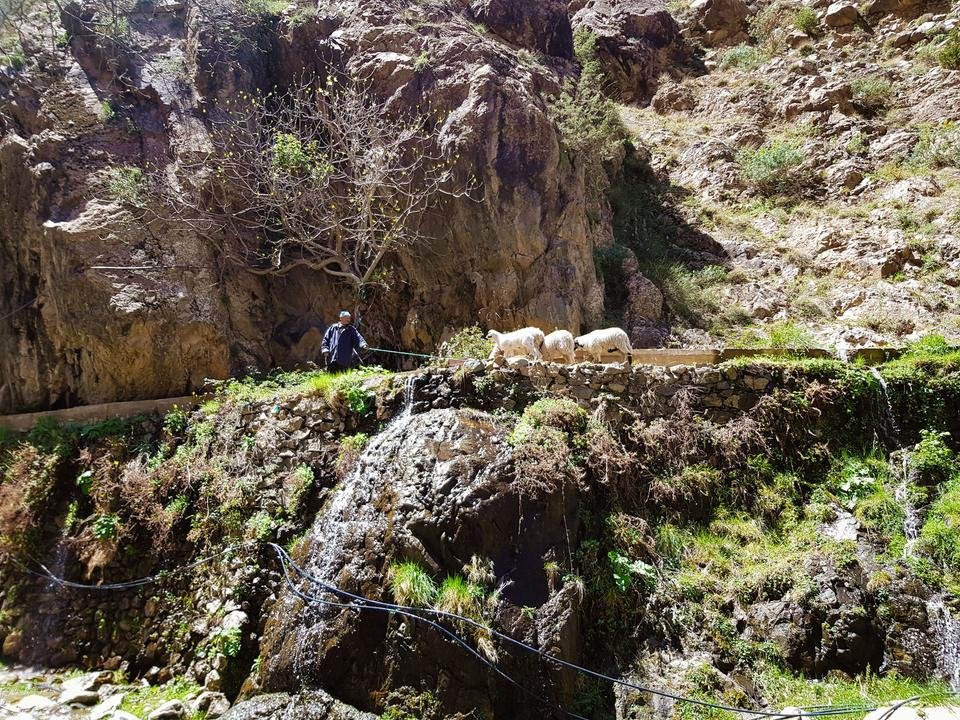 Afortunadamente logramos cruzarlo y subimos más y más alto. El camino se hizo más empinado y empinado hasta que finalmente estábamos trepando rocas y mini cascadas. Agotado, tropecé con una bonita tienda en el camino, vendiendo recuerdos de cerámica hechos en casa. Una cosa que comenzamos a notar también fue que hacía más frío. Cuanto más subimos, más rápido el agua y más empinada la ruta se convirtió en hasta. Casi listos para rendirnos, vimos a algunos granjeros liderando filas de ovejas al otro lado del acantilado con increíble habilidad.