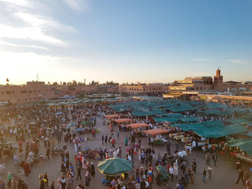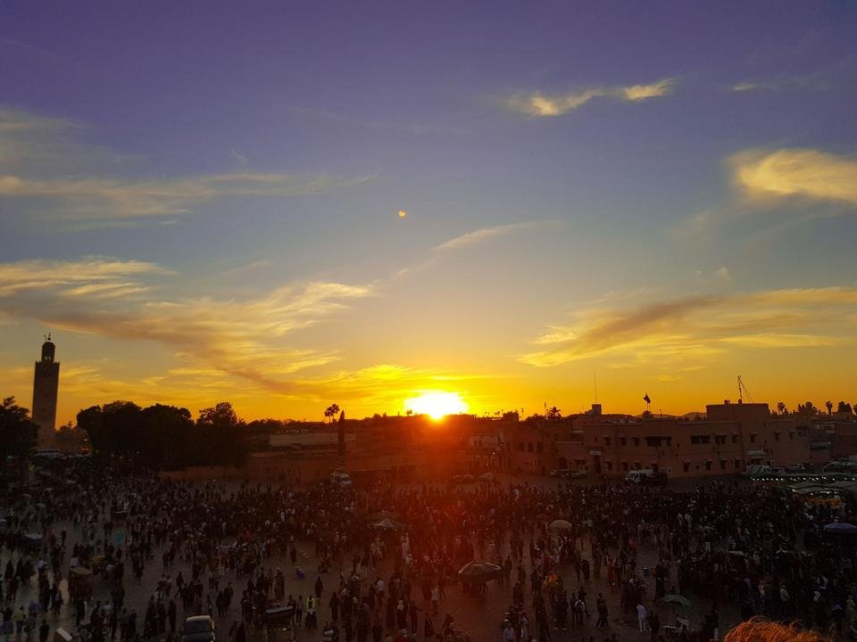 Condujimos de regreso a Marrakech, agotados pero con una sensación satisfactoria de logro. Sabíamos que era nuestra última noche, así que lo celebramos con la única forma en que Marruecos nos había enseñado. Toma una refrescante taza de té de menta mientras observas la puesta de sol en la plaza Jemaa El Fna. Si alguna vez vas a Marrakech, asegúrate de ir al Le Grand Balcon, que se traduce en The Grand Balcony, por las mejores vistas de la plaza durante la puesta de sol. Te puedo garantizar que no te arrepentirás.