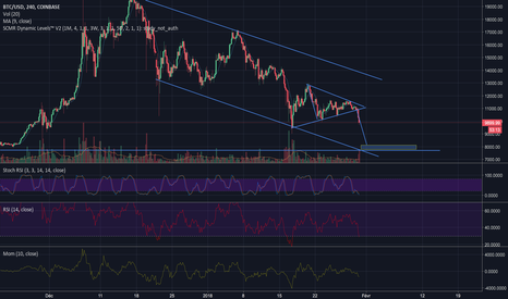 Le BTC/USD à break le support que j'avais mis en évidence dans l'analyse précédente, maintenant là patience est de mise, afin de voir si ça forme un double bottom, dans le cas contraire, le meilleur point d'entrée dans la zone des 8k$.