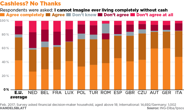 Les Allemands ne sont pas les seuls à s'inquiéter d'un possible futur sans cash. D'après un sondage Ipsos pour ING-Diba publié en 2017, les Autrichiens sont tout aussi opposés que les Allemands à une disparition du cash, même si son utilisation y est moins importante qu'en Allemagne. Les Italiens et les Espagnols sont eux aussi fortement opposés à une disparition des pièces et billets. Même chose en République tchèque et au Royaume-Uni,