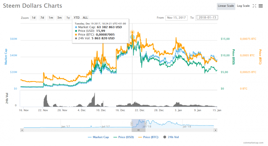 Courant 2017, à partir du printemps, il y a eu un très fort engouement pour les cryptomonnaies, et plus particulièrement pour le Bitcoin et l'Ether. Dans leur sillage, les altcoins ont vu leurs prix augmenter, et leur volume d'échange aussi. Le Steem et le Steem Dollar (SBD) n'ont pas échappé à la règle. Le Steem est passé de 0,07 dollar en mars 2017 à 2,5 dollars en juin de la même année avant de retomber aux alentours de 1 $ à l'automne suite aux nombreuses mesures de régulation annoncée par plusieurs États, notamment la Chine. On a vu une nouvelle embellie en novembre et décembre 2017, quand le Bitcoin a battu plusieurs records pour atteindre environ 20 000 dollars. Durant cette période, le Steem est allé jusqu'à 3,78 $ (et même 7,44 en janvier), tandis que le Steem Dollar a atteint une valeur d'environ 16 dollars le 19 décembre.