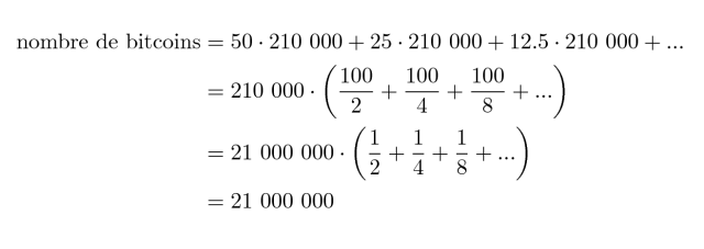 Enfin, la création des nouveaux blocs est arrangée mathématiquement. D'une part, l'ajustement de la difficulté de minage permet de maintenir une moyenne de 10 minutes dans la fréquence des blocs. D'autre part, pour limiter la quantité de bitcoins en circulation, la récompense distribuée aux mineurs diminue avec le temps. La rémunération par blocs est réduite de moitié tous les 210 000 blocs, soit environ tous les 4 ans. Initialement de 50 bitcoins par bloc, elle est passée à 25 bitcoins par bloc en 2012, puis à 12.5 bitcoins en 2016. Cette diminution géométrique doit être compensée par une courbe d'adoption exponentielle (qui conduirait à une augmentation du prix). À terme, la création monétaire s'arrêtera et le réseau fonctionnera uniquement grâce aux frais de transaction. Le nombre maximal de bitcoins (égal à 21 000 000) est d'ailleurs facilement calculable grâce à une formule élégante :