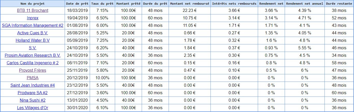 En Janvier 2020, j'ai prêté à 2 entreprises pour un total de 140€ et une durée de 36 mois pour chaque projet et un taux moyen de 5,3% annuel brut.