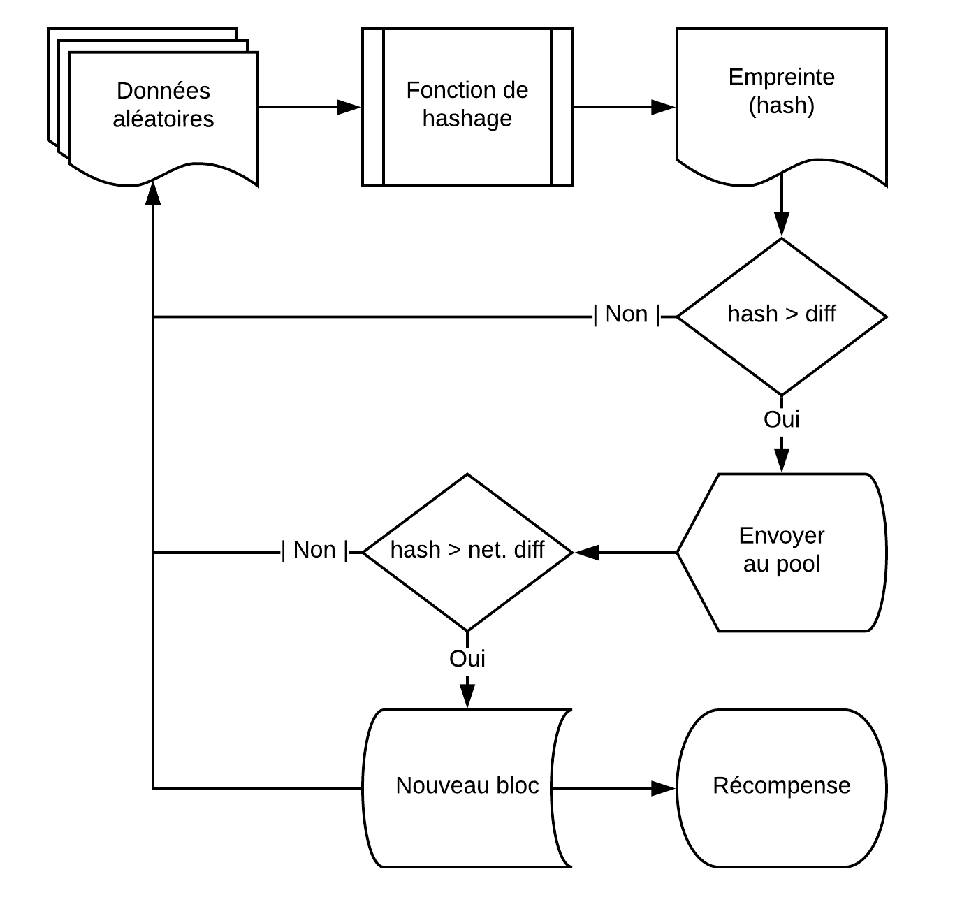 Un logiciel (communément appelé « mineur ») prend des éléments aléatoires et les fait passer à travers une fonction cryptographique. La sortie est un hash. Il répète le processus jusqu'à ce que le hash dépasse une certaine difficulté (dictée par le réseau ou le pool). Une fois la difficulté dépassée, les données qui ont servi à produire ce hash sont utilisées (sur le réseau ou soumises au pool). Il répète indéfiniment ce processus.