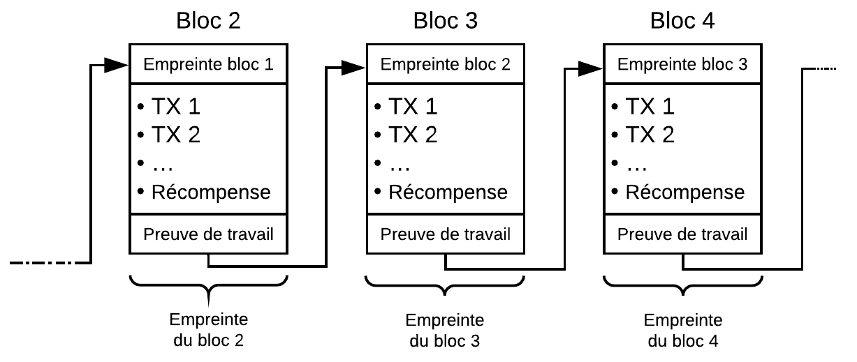 - Chaque bloc contient l’empreinte du précédent.