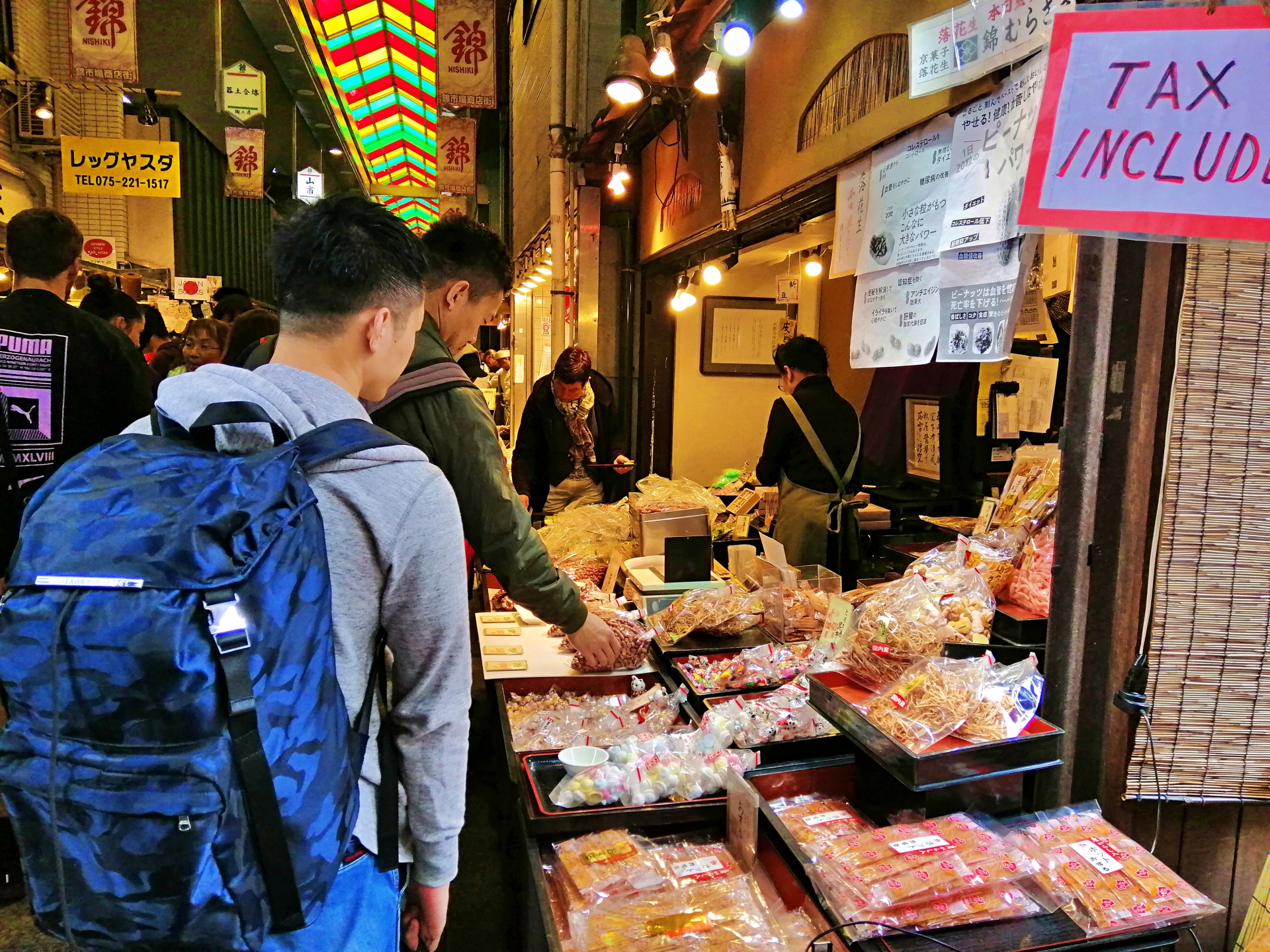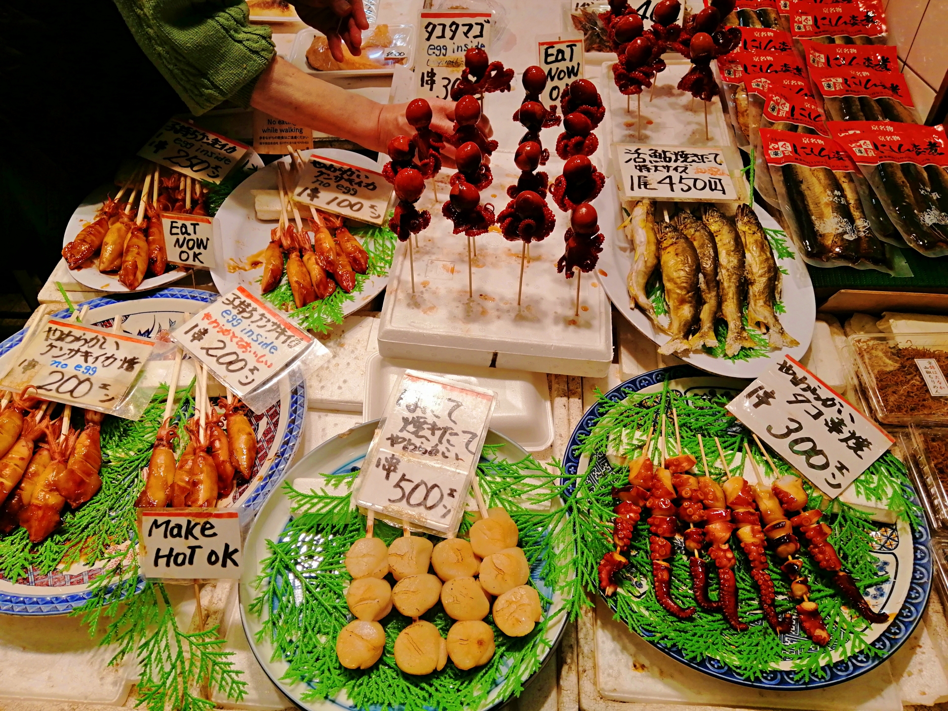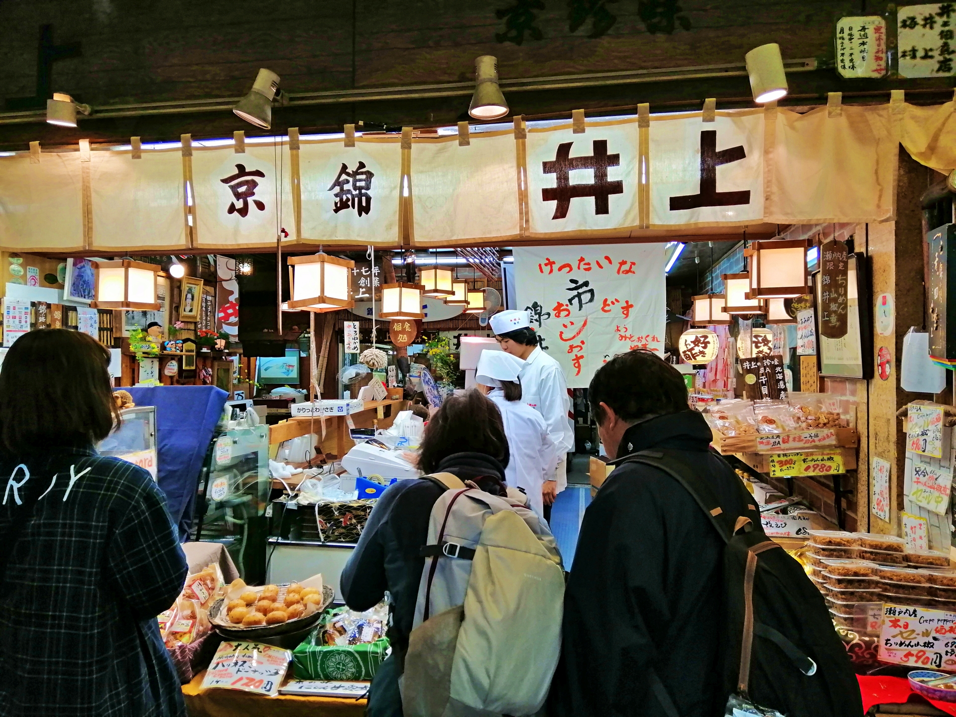 Une fois de plus, nous aurons pris notre temps 😂 L'heure du déjeuner est loin derrière nous lorsque nous faisons finalement nos premiers pas dans le marché de Nishiki Ichiba (錦市場), une rue commerçante de cinq pâtés de maisons bordée de plus de cent boutiques et restaurants. Connu sous le nom de "Kyoto's Kitchen", c'est un endroit très animé et bondé toute la journée. Vous trouverez ici des fruits de mer frais, des produits de saison, des spécialités Kyoto et bien plus encore....
