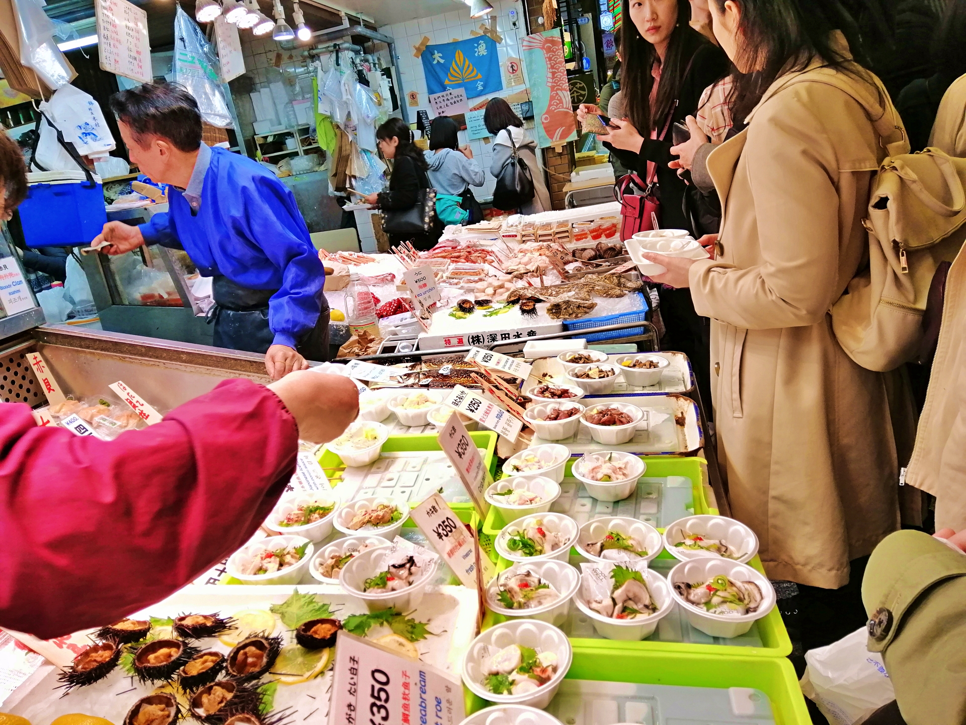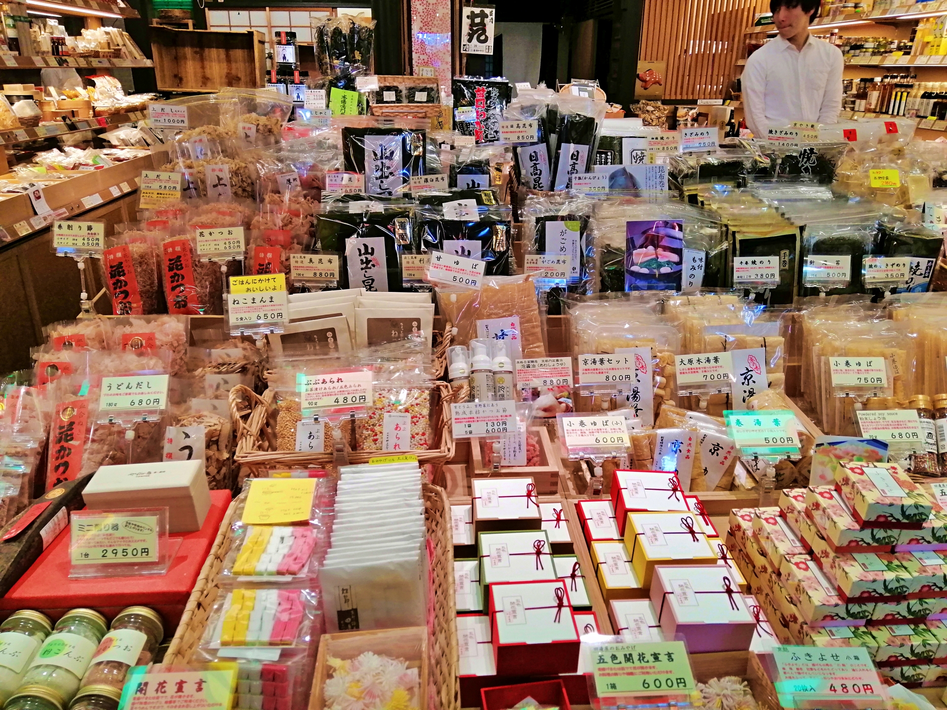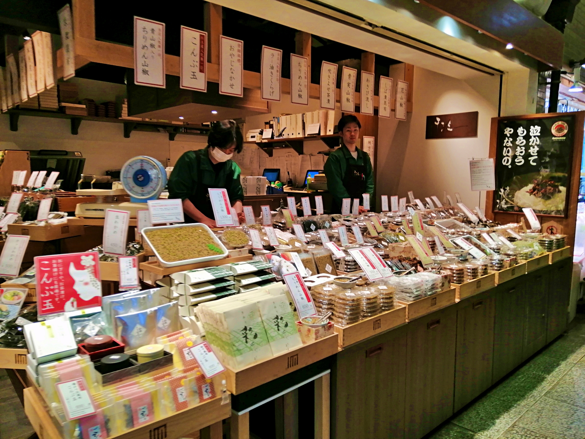 Une fois de plus, nous aurons pris notre temps 😂 L'heure du déjeuner est loin derrière nous lorsque nous faisons finalement nos premiers pas dans le marché de Nishiki Ichiba (錦市場), une rue commerçante de cinq pâtés de maisons bordée de plus de cent boutiques et restaurants. Connu sous le nom de "Kyoto's Kitchen", c'est un endroit très animé et bondé toute la journée. Vous trouverez ici des fruits de mer frais, des produits de saison, des spécialités Kyoto et bien plus encore....