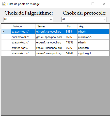 Vous pouvez sélectionner les pools correspondant uniquement à un algorithme et/ou uniquement à un protocole spécifique, afin de trouver rapidement ce que vous chercher, et lorsque vous sélectionner le pool de minage les champs de saisie correspondants sont automatiquement remplis sur la fenêtre principal.