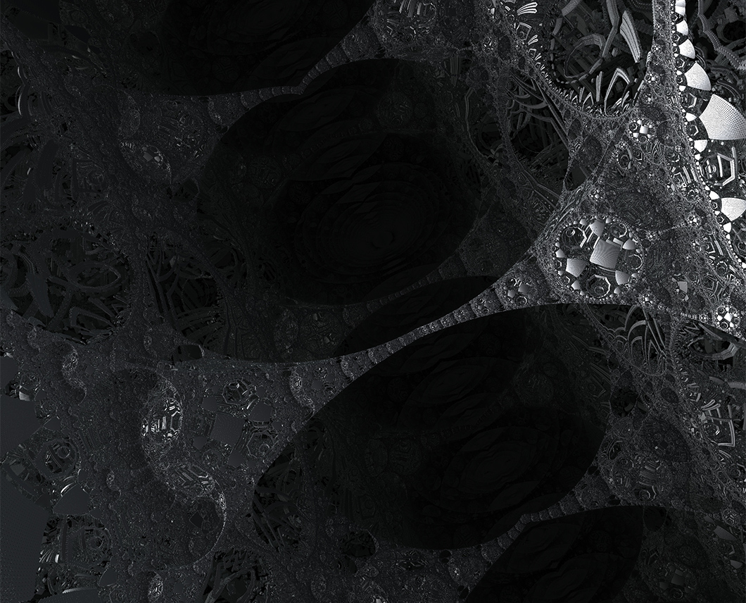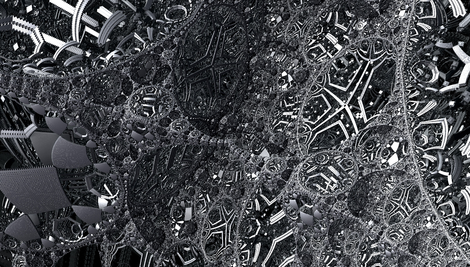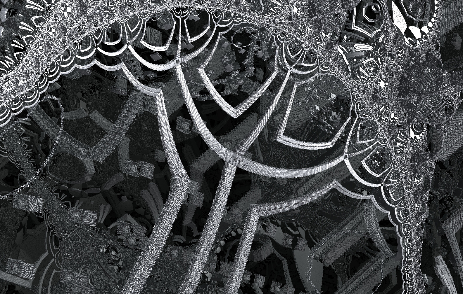 - a fractal render from my "killuminati series" parameter set, made of white noise selforganizing in 3d space under simple rules. All concrete structures are made out of billions of tiny black&white cubes arranged like 3 dimensional checkerboard.