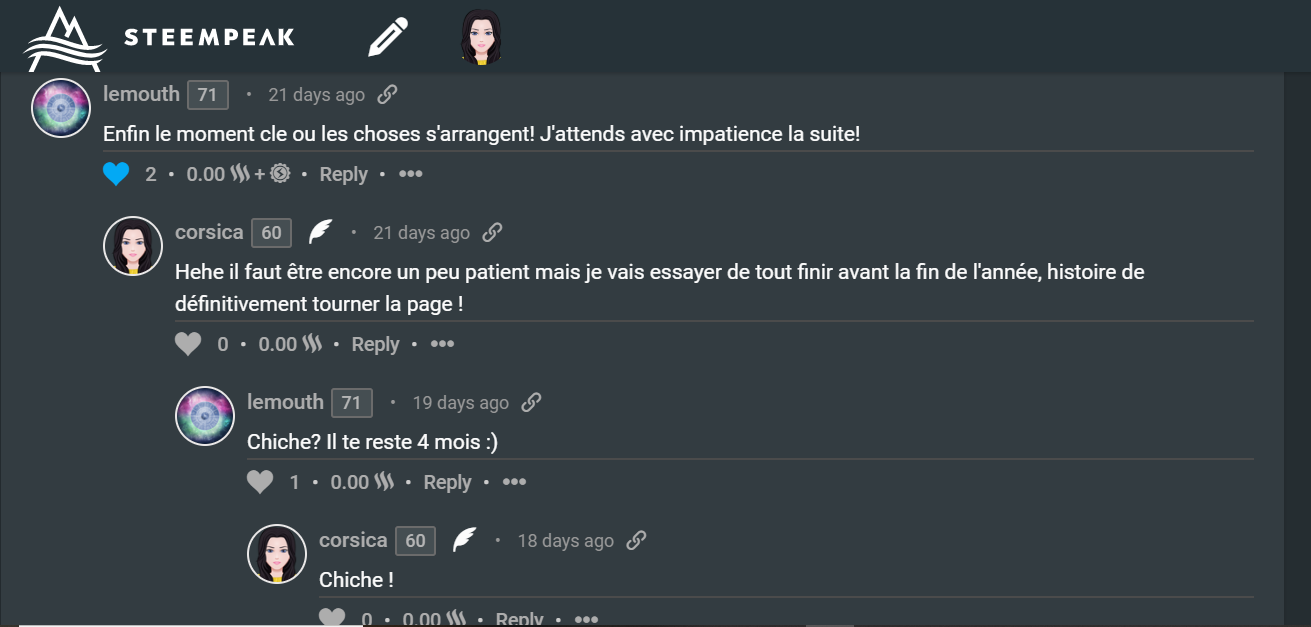Encore une fois merci pour ton commentaire. Tu as vu je suis allée vite cette fois-ci ! et le suivant est déjà en cours. Je suis obligée, j'ai dit chiche à @lemouth.