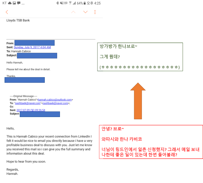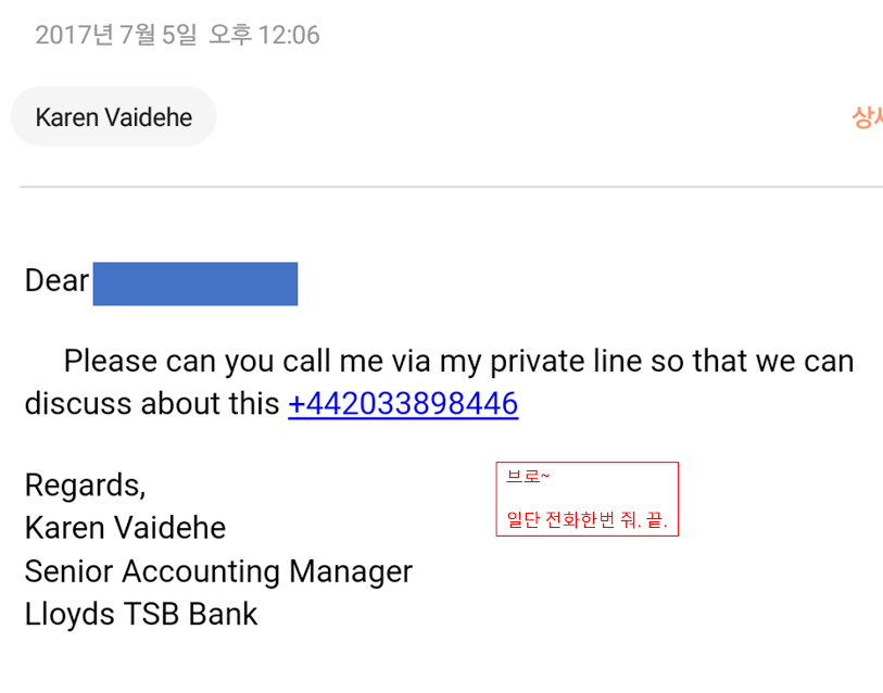 다음 단계는 뻔합니다. 이걸 빼내는데 수수료가 드니 어디어디에다 얼마 입금해라.. 그리고 잠수타는 거지요. 그래서 저는 그 수법에도 이렇게 응대를 하려고 했습니다. "브로.. 나 돈 없어 나 좀 빌려줘. 그럼 그 돈 받으면 두배로 갚을게.." ㅎㅎㅎ