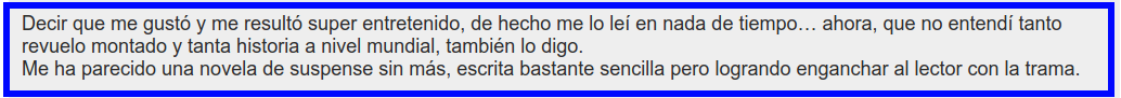 bueno eso no tiene fuente y es la mismisima review del libro que la señorita @bibliotec0n (tu amiga muy cercana) o quien sea que maneje la cuenta, hizo, esa misma review del libro esta plagiada de la fuente mencionada en este post.