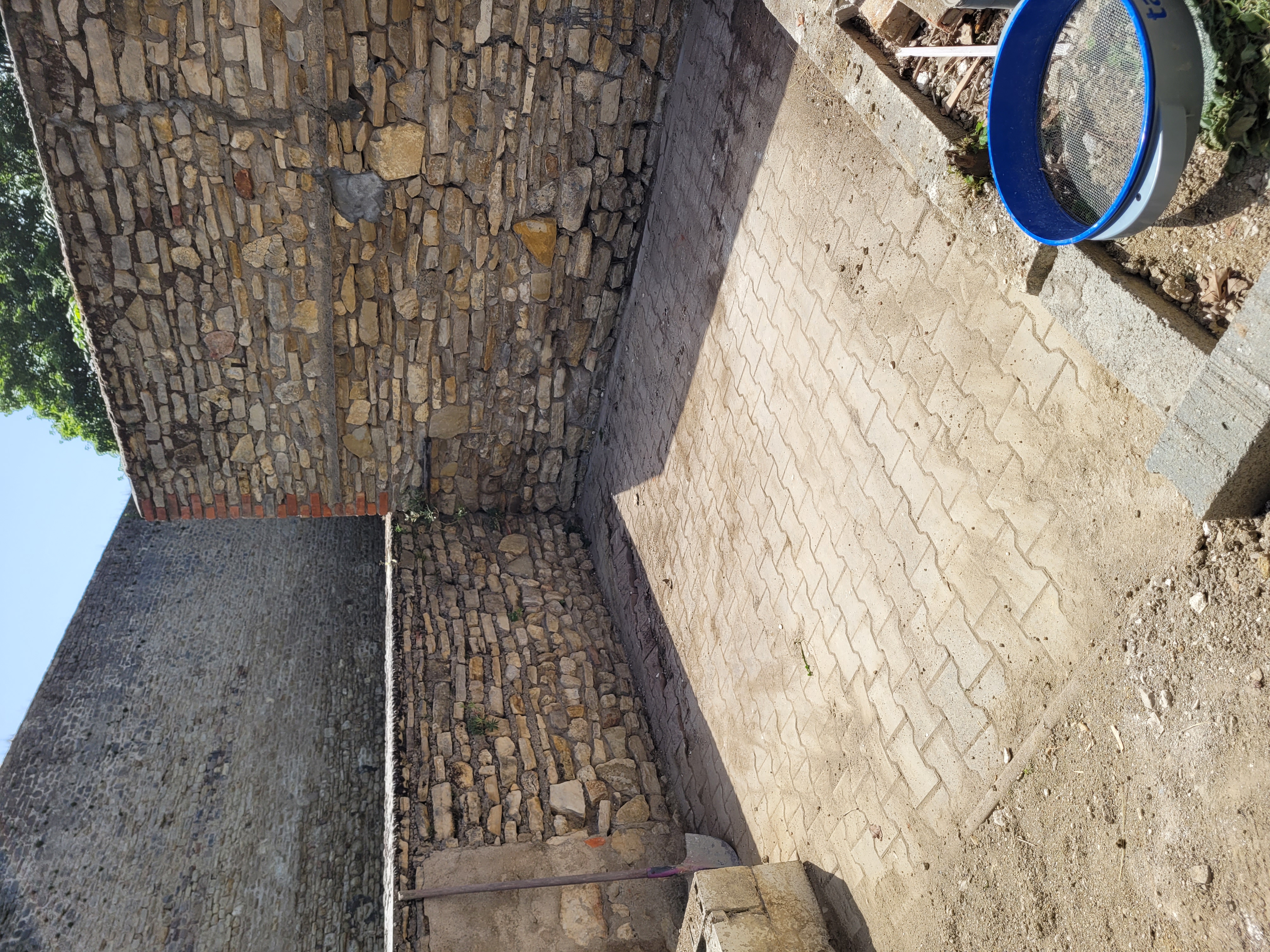 Enlever les pavés, mettre le terrain de niveau, nettoyer les pavés et les reposer.....