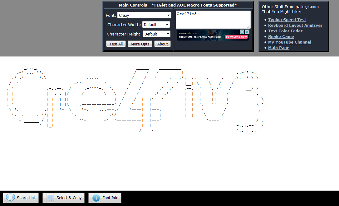 Generador de textos en formas con ASCII. Algo muy popular en la época que las computadoras tenian la capacidad de procesamiento grafico de un paquete de galletitas humedo y viejo. Pero aún asi, esto no pierde el romanticismo para los que somos un tanto mas ancianos de cuerpo (mas no de mente)