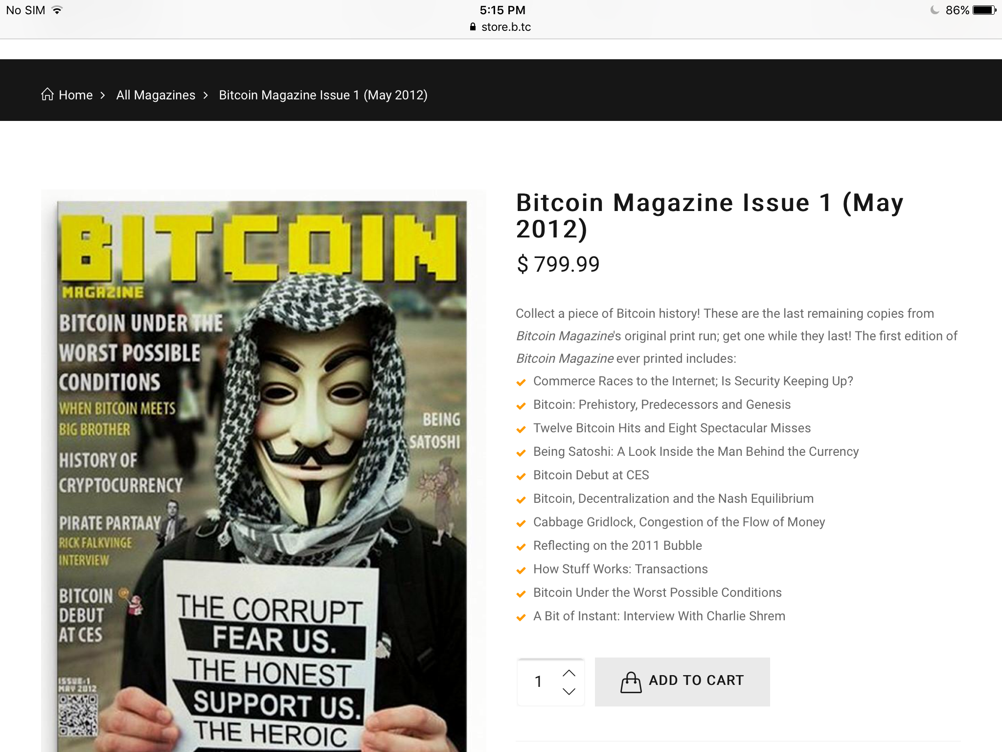 To show you all how it is done, here is my own bid of 15.804 steem (about $5.20 at current coinmarketcap.com price). If no one bids at least 15 steem higher (about $5 dollars higher) I will have won back my own Bitcoin Magazine, valued at well over $700, for a $5.20 donation to crypto freedom!