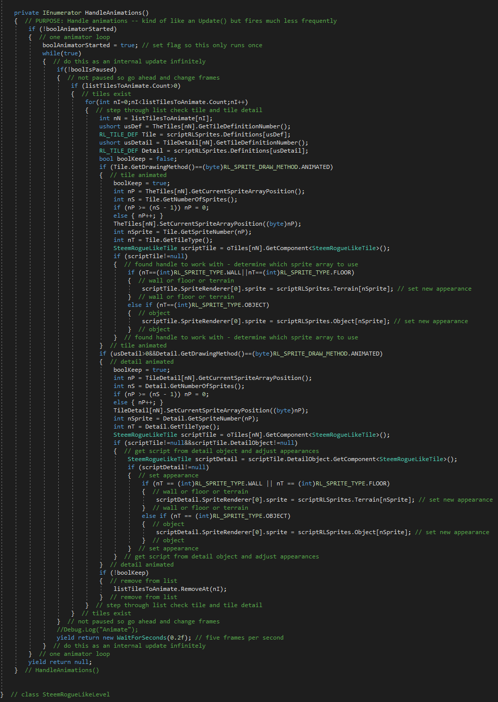 This is a large and involved script. It takes all of the above scripts and provides all the tools we need to instantiate maps with both animated and not animated sprites. It will support handling the animations in a more process efficient manner than simply using Update(). It will only be used as needed.