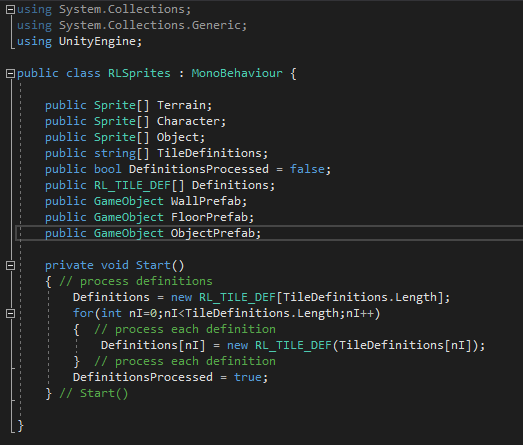 It has a spot for putting string definitions of tiles as used to construct RL_TILE_DEF. It now also has a Start() method which is instructed to process those definitions.