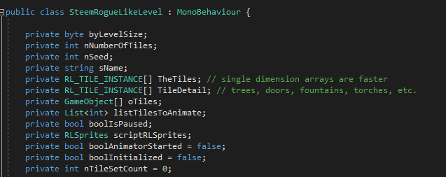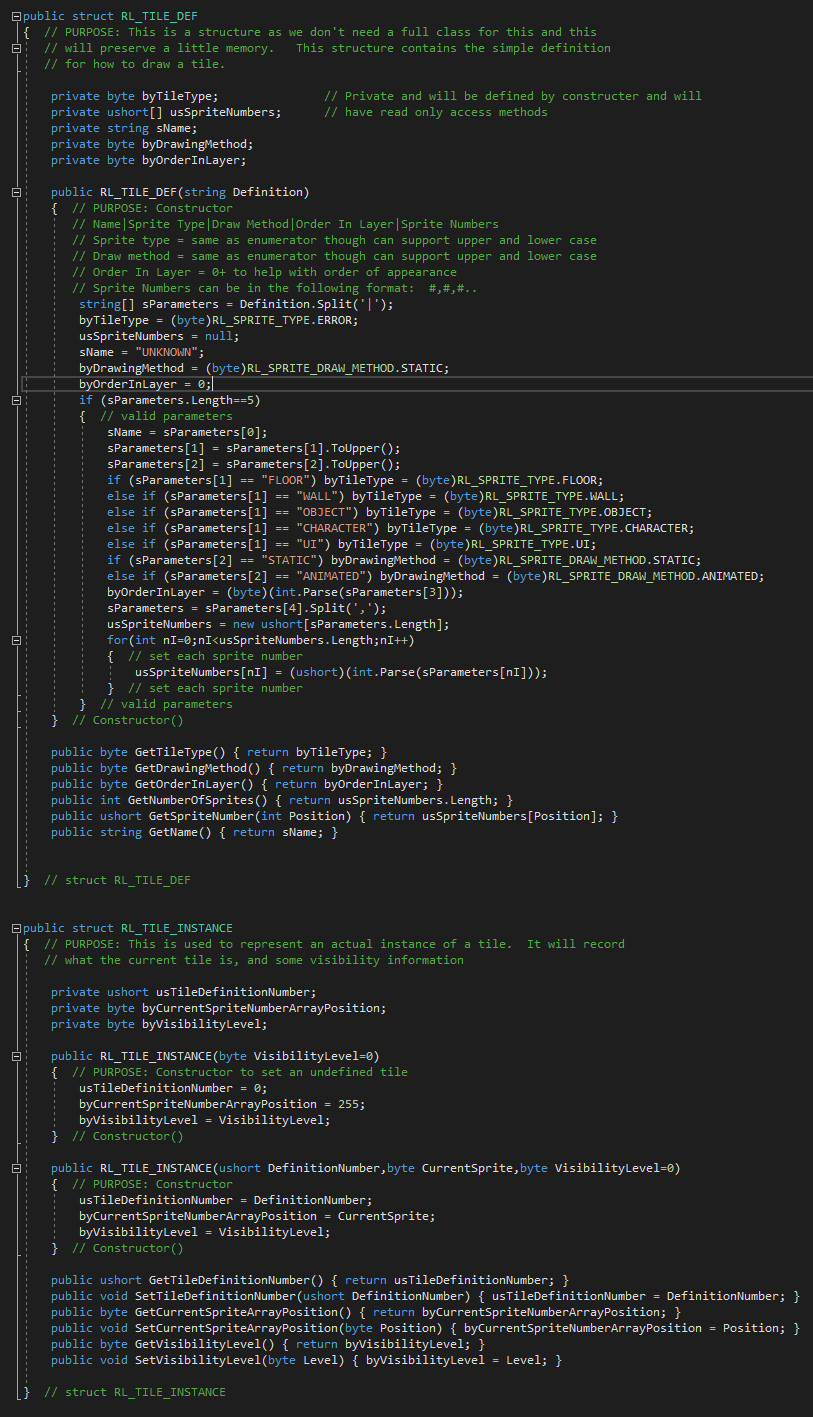 RL_TILE_INSTANCE is used to represent specific occurrences of the previously defined sprites above. In unity terms RL_TILE_DEF is like the Prefab, and RL_TILE_INSTANCE is what you get when you instantiate a tile.
