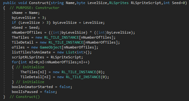 This technically is not a constructor. I had a constructor, but I needed something I could call later, so since it does a lot of similar tasks you'd expect from a constructor I called it Construct. This is the first method that should be used before trying to do anything else. It will size the arrays and setup some initial values.