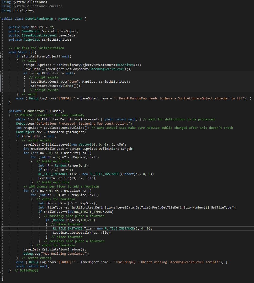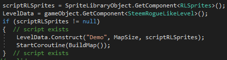 Then it launches a coroutine that waits until all definitions have been processed. At that point it places random occurrences of the first to definitions on RLSprites as Tiles.