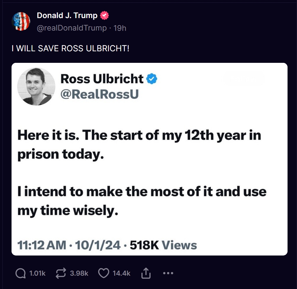 Thank you President Trump!squirrellywrath (49)in #freeross • 2 years ago A heartfelt "Thank you!" to President Trump for pledging to commute Ross' sentance on Day 1. #bitcoin #liberty