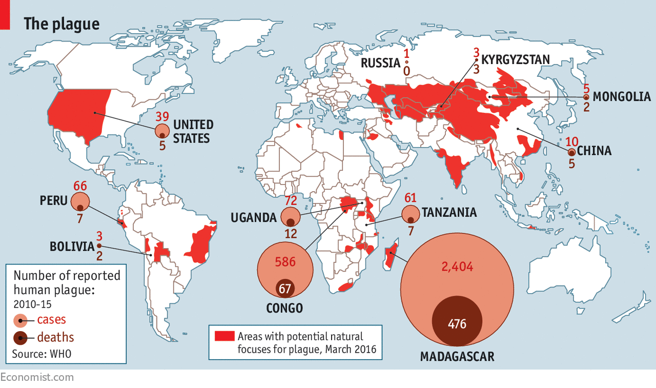 Here's a world map with some plague numbers from 2016. Notice Madagascar's infection to death ratio... very sad to think that we've only contained the plague for centuries, but have never come close to wiping it out. This graphic only shows numbers from a few countries, so I imagine the numbers are much higher worldwide. But again, it's not publicly talked about, just like there are still cases of sars every year and family members of the affected are ordered to keep it quiet. Not speaking from personal experience, but I know someone who was told to keep silent while their loved one was dying in intensive care in front of them, and I can't imagine the anger and confusion they must have felt.