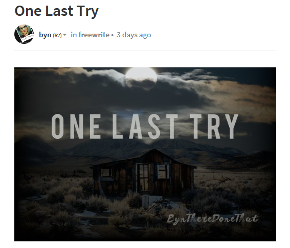 Listen up everyone! @byn is back in the house! She never disappoints. The dark story she wrote, "One Last Try" is so full of imagery that it heightened all of my senses to make me feel like I was there. I could especially feel the pain and despair of the character, and the ending was a cliff-hanger. You don't want to miss this one.