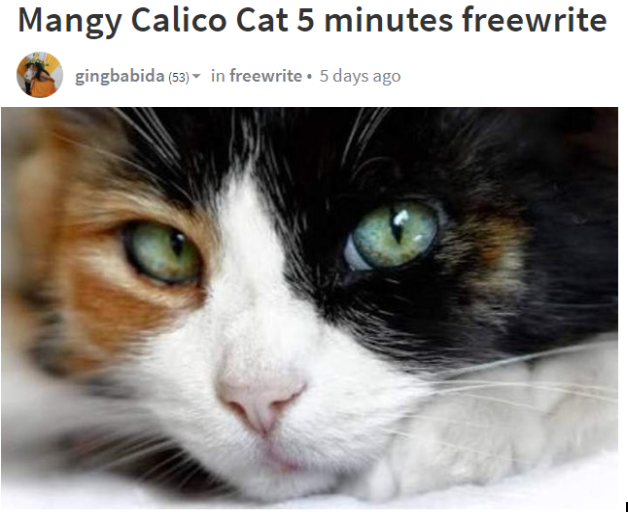 The calico cat prompt drew me too. Limiting myself to just one Favorite (for the second week in a row!), I'm calling attention to a new Freewrite member who just posted his first freewrite with us--and he's only just learning English. We at @Freewritehouse have a lot of respect for non-native English writers. I love @gingbabida's commentary on mange.