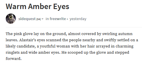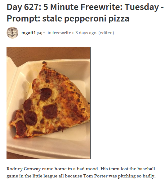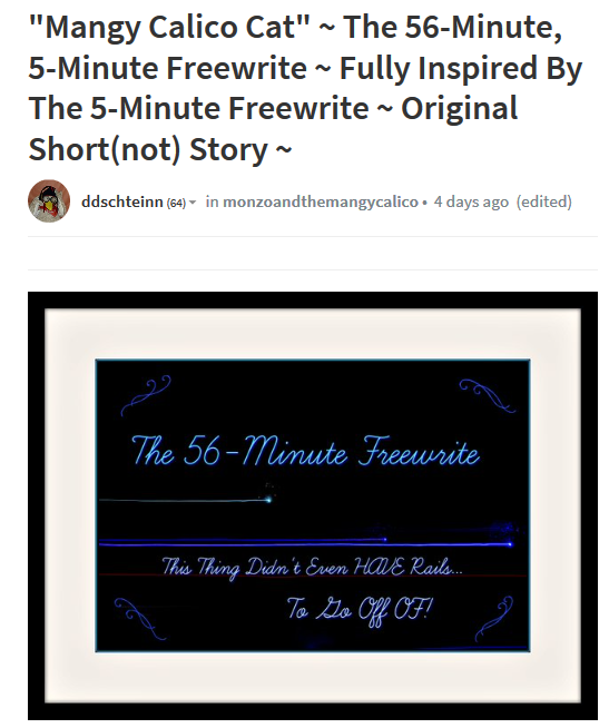 If you are not familiar with the daily freewrite prompt and the many wonderful writers who produce the most amazing 5-minute (or sometimes much longer) Freewrites, go to @mariannewest and look for the prompt. The graphics look like this