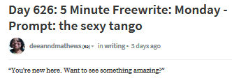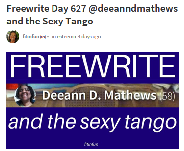 I was laughing like crazy with @fitnfun's hilarious freewrite for the 2 prompts: @deeanndmathews and the Sexy Tango. @fitnfun gives us her interpretation of what she thought happened with the prompt mix up, by writing her own version of a conversation between @mariannewest and @dreemsteem. You don't want to miss this one either.