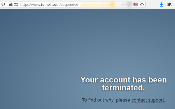 The post then appeared on Tumblr as expected, and I surfed the site a bit. But three minutes later, I was suddenly required to log in again. I tried repeatedly, no success. Till, after four tries, I got the unpleasant message 'This account has been suspended.' No reason given. WTF man. I was flabbergasted.