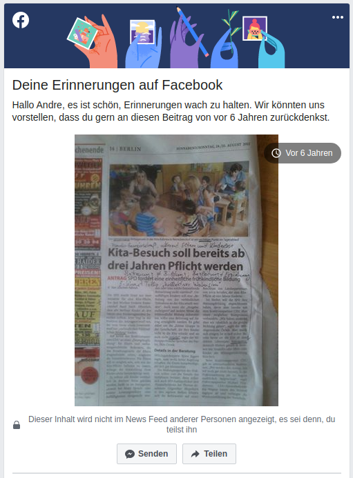 And then one day I began to write down thoughts directly into those papers. Occasionally I passed them on. The above memory tells about it. In that case I even shared such a copy with fb. It was about politically dictated education. The effort to deal with this now was considerably smaller. I was able to make room for my frustration. The feedback was no less than before. And finally I stopped spending as much of my time as possible with reduced reports and inadequate statements.