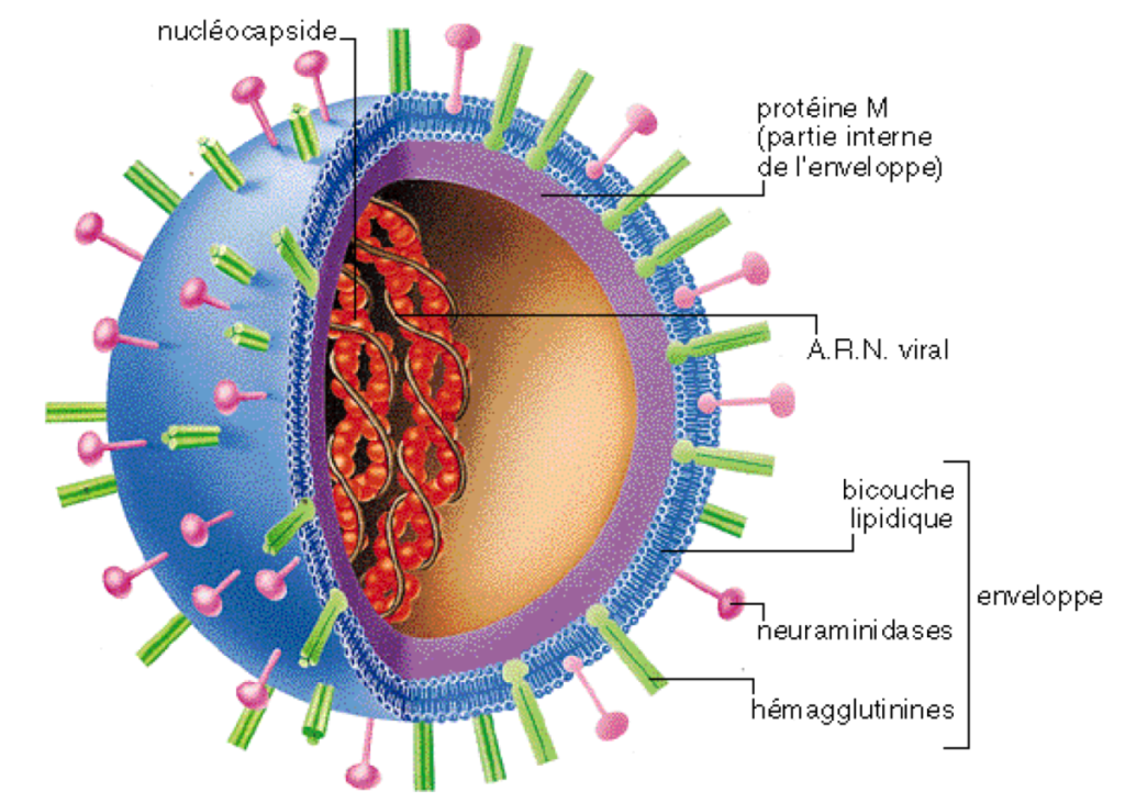 Le virus de la grippe est un virus à ARN la famille des Orthomyxoviridae. Il est encore appelé Myxovirus influenzae. C’est un virus enveloppé comprenant une capsule protéique à l’intérieur de laquelle se trouve son ARN comprenant 8 segments. Sa transmission d’hôte à hôte se fait par voie aérienne par les gouttelettes de Pflügge.