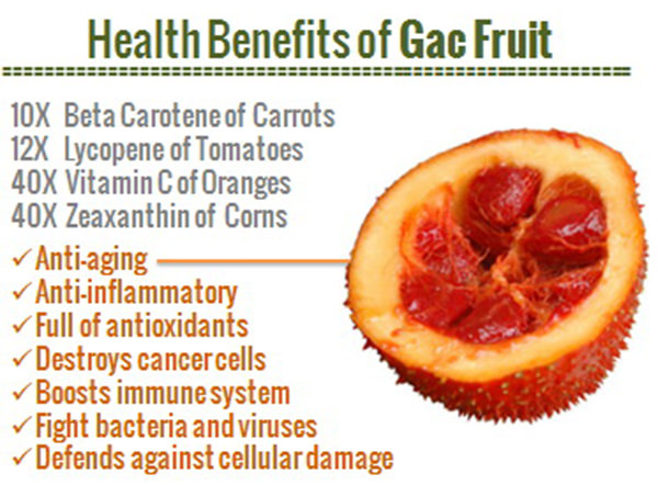 As with most fruits and vegetables that are orange/red in color, gac fruit contains a high concentration of beta-carotene and lycopene. And most of the claimed health benefits of the gac fruit arise out of this high beta-carotene and lycopene concentration.