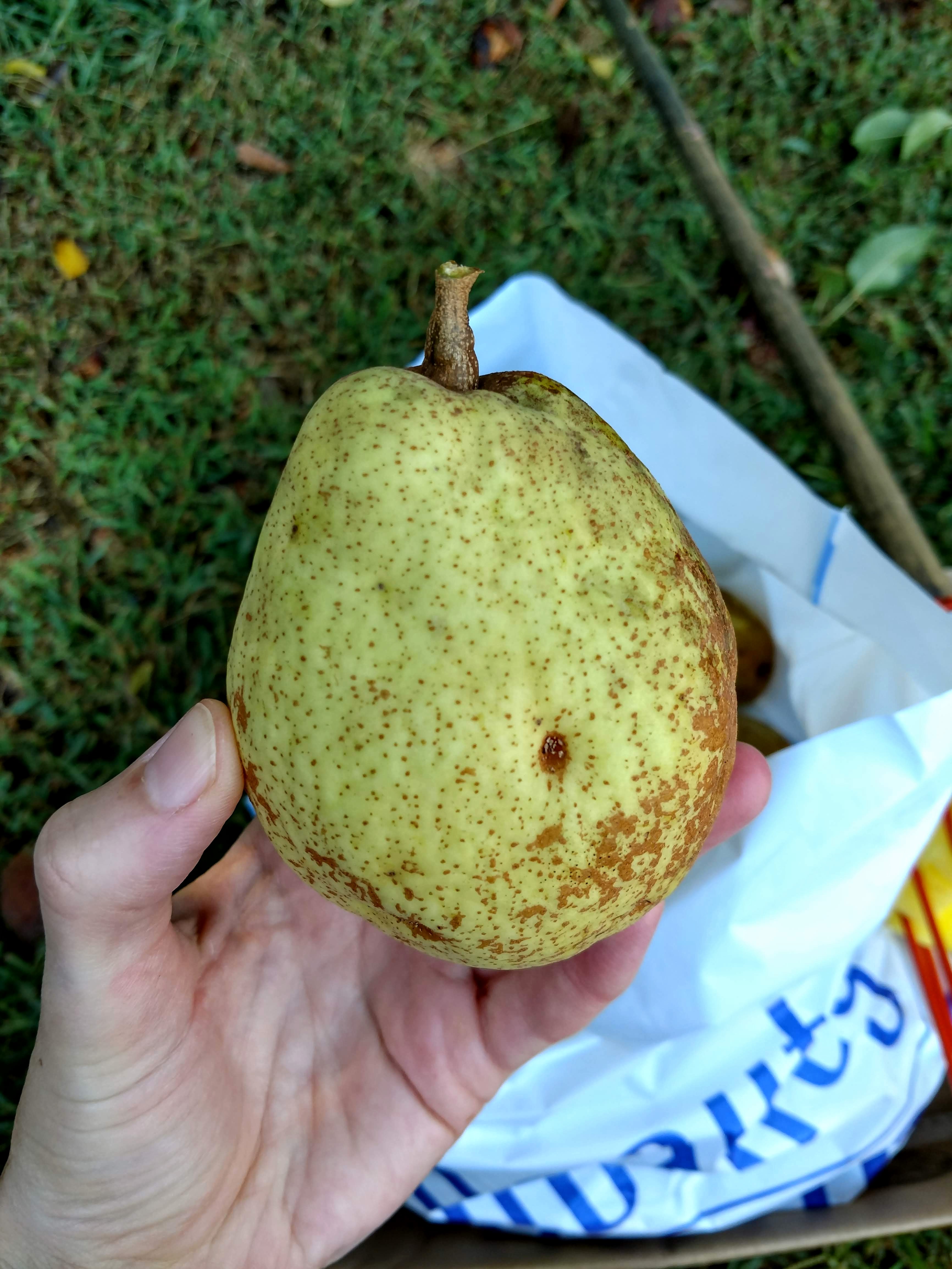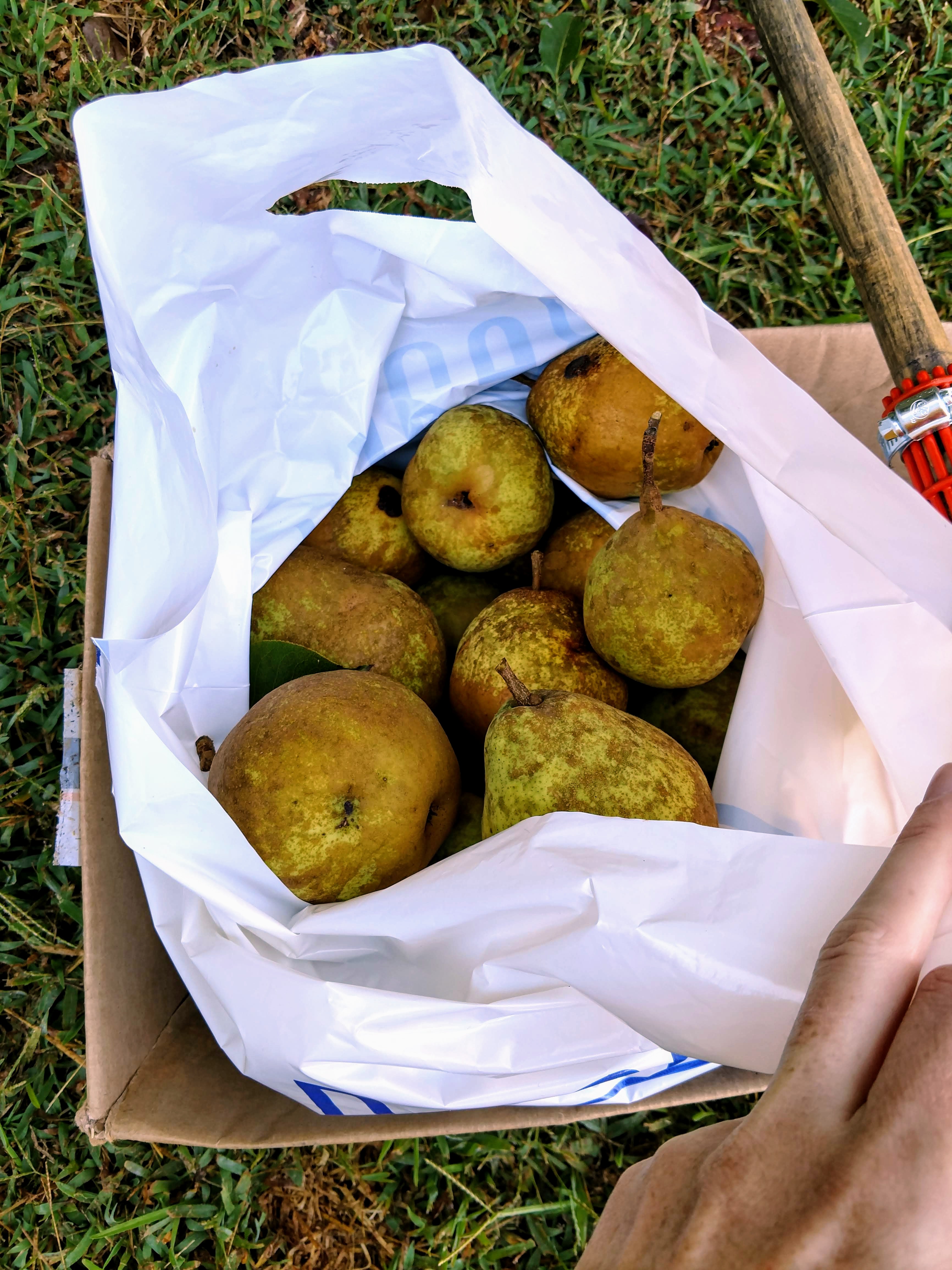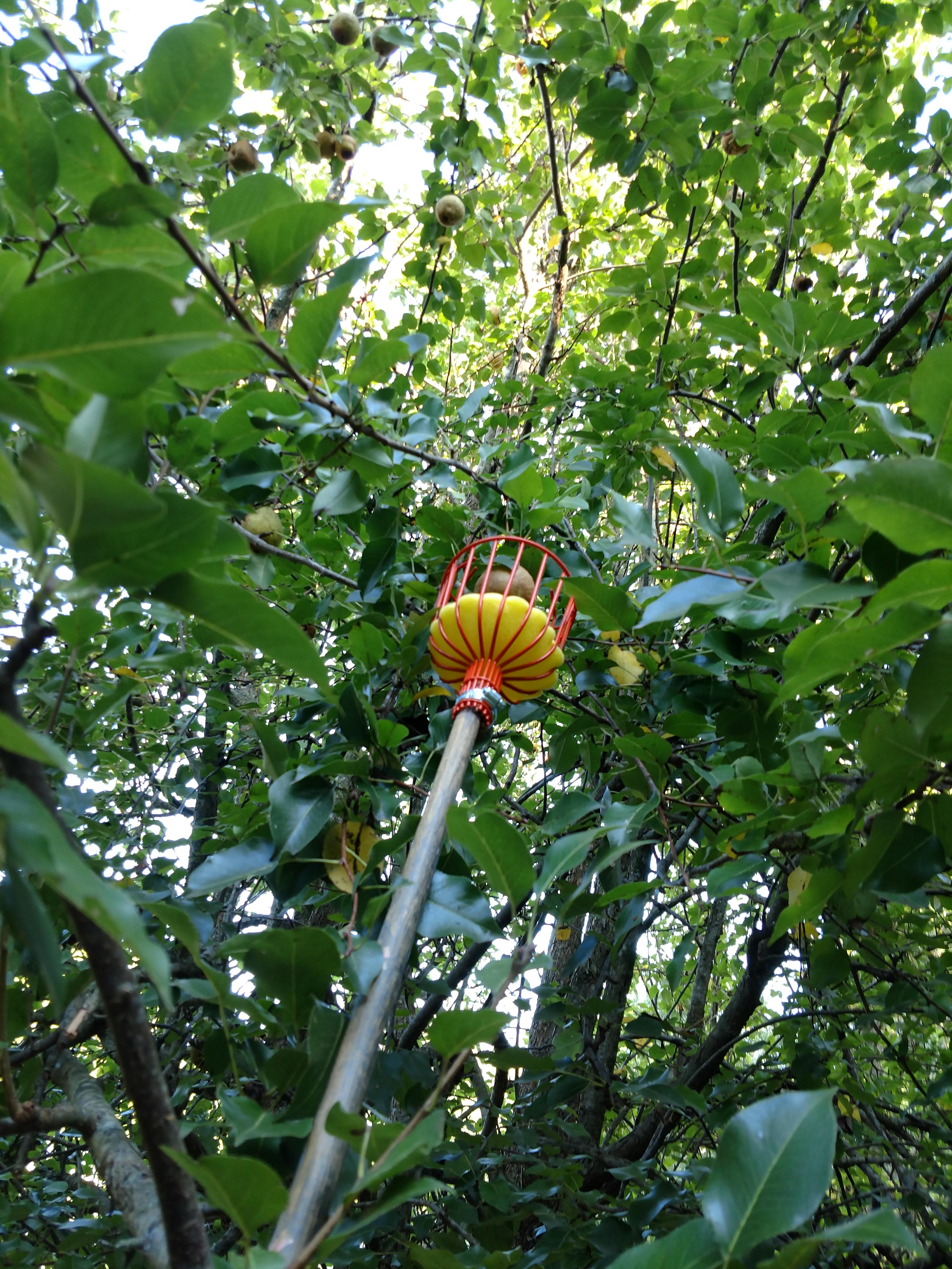 Lots of pears had already dropped and were being enjoyed by a number of critters. His parents had also picked the bulk of the low-hanging fruit. Luckily they had a nifty little tool to get to some of the higher fruits, which were actually in much better shape anyway.