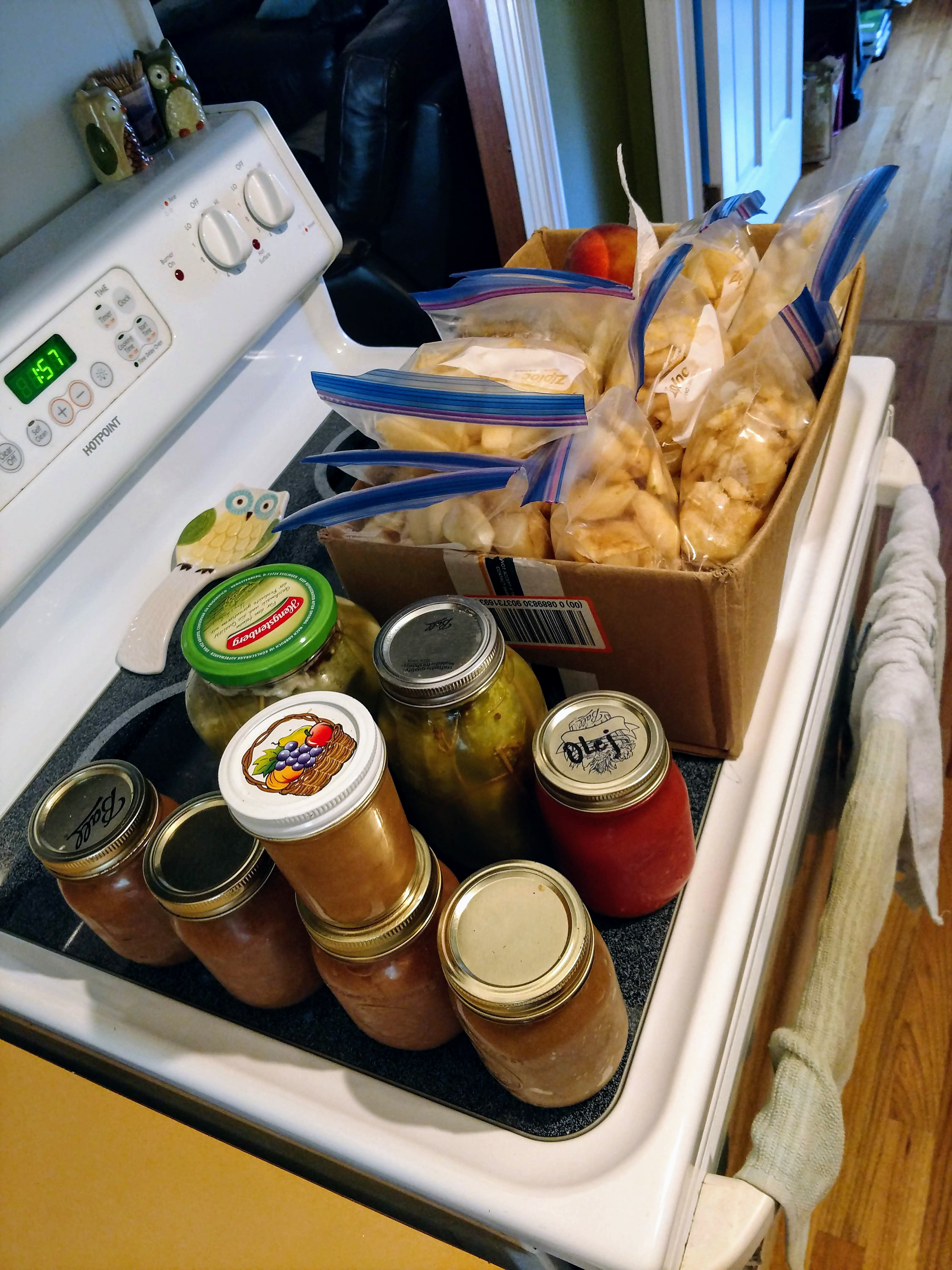 Along with 10 quart-sized bags of peeled, chopped pears, of course she sent us home with some of the pears she cooked down, homemade fermented pickles and tomato sauce like the true Polish mama she is. I might need another refrigerator soon, and even the freezer is still full to the brim. Each time I pull out a bag of the pears this fall and winter I will think of her, though, and hopefully take a moment to be mindful of this bounty. I still fully intend to go apple picking soon, but this was a nice boon to the fruit stash at no cost other than the labor of love.