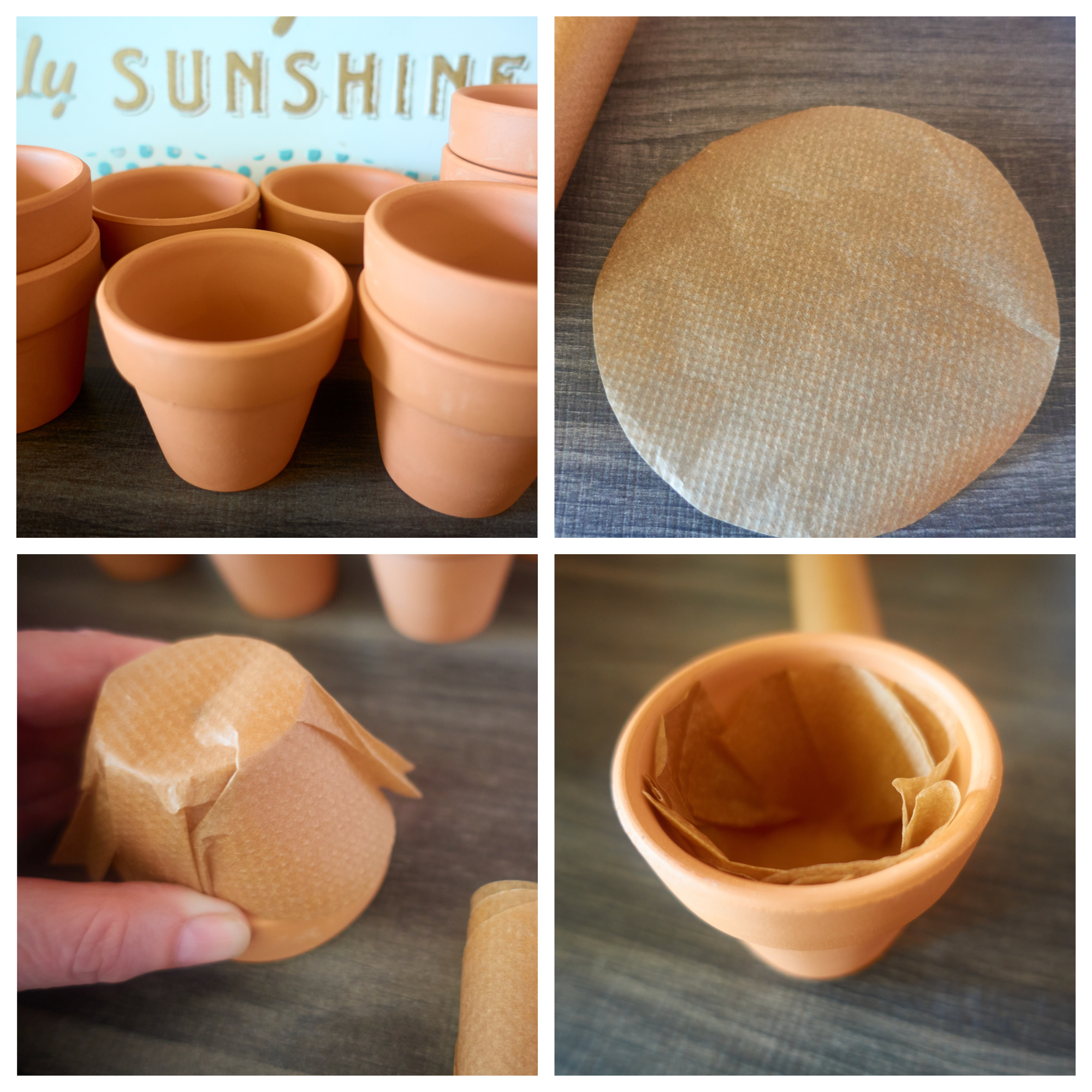 Cut circles out of the baking paper with a diameter of 15 cm, turn the terracotta molds over and place the baking paper in the center and press on the mold. Then place the shaped baking paper in the molds.
